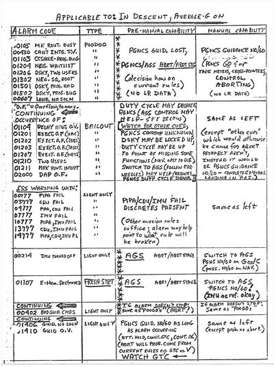 Just weeks prior, he had mistakenly called an unnecessary abort during a mission simulation in response to an alarm. To prevent this from happening again, his deputy Jack Garman made a handwritten cheat sheet of all the possible error codes.