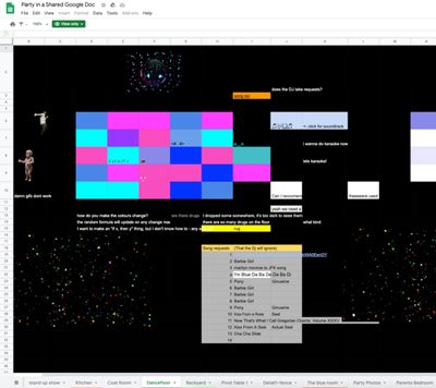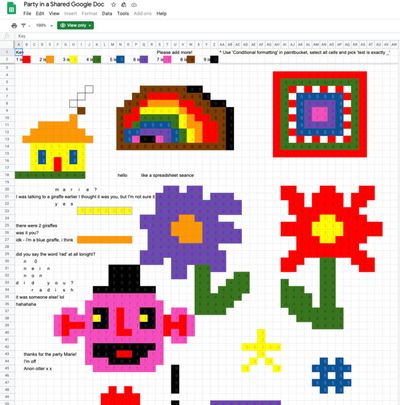 Marie Foulston wrote about a spreadsheet party she hosted during the COVID-19 lockdown. She wanted to create a socializing space “for the mundane, the idle, and the liminal” Because she was finding social video calls too exhausting, she set up a shared Google Sheet. She invited friends to party inside the document.