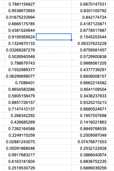 Numbers scroll by me as I float downwards. I used to memorize them during practice runs to pass the time, but somebody turned them into =RAND()'s and now they’re always changing. I like it better this way. It keeps me on my toes.