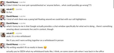 I had a similar experience collaborating in real-time with Micah Walter on a Google Spreadsheet back in April. We were doing things like leaving comments next to each others’ cursors to create conversation threads in situ and blinking the highlighter to call attention to parts of the document. We used Slack as a backchannel even though Google has a chat window built into the spreadsheet. This space felt unique. It was like we were standing inside a shared whiteboard. We were dancing with each other on top of data.