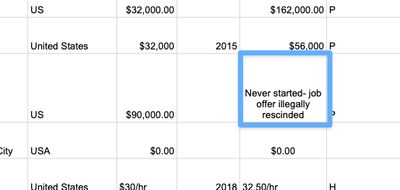 There are microstories in the spreadsheet, as well. On row 2453, you’ll find the entry for an Associate Curator at MoMA PS1 with a starting salary of $90K. There is a curious note in column H, “Never started - job offer illegally rescinded.”