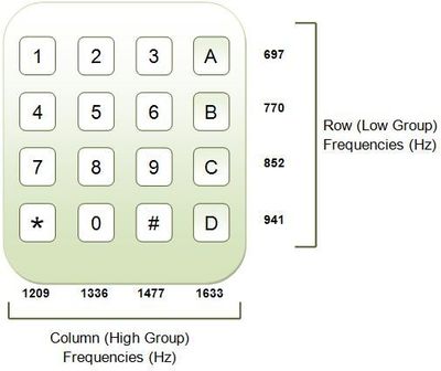 The International Telecommunication Union’s (ITU-T) Recommendation Q.23 specifies DTMF tones. The row frequencies range from 697Hz to 941Hz, and the column frequencies are in a higher range from 1209Hz to 1633Hz. The engineers selected these values because they are not common in music or speaking, but are still within the human hearing range, which phone systems can easily support.