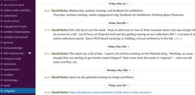 I created a #zeitgeber channel in the museum’s slack workspace, and for a while, some people joined me in there, writing their own notes. It was great to sync up my heartbeat with colleagues I might not ordinarily see during the day. Then COVID-19. Habits are difficult to keep. I see my colleagues even less, and sometimes I’m a firefly blip-blipping all alone in the forest.