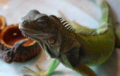 This is my iguana (about 10″ Snout to Vent, so about 2 years old) after he was spritzed with Bio-Mist, an aloe vera and cactus juice…